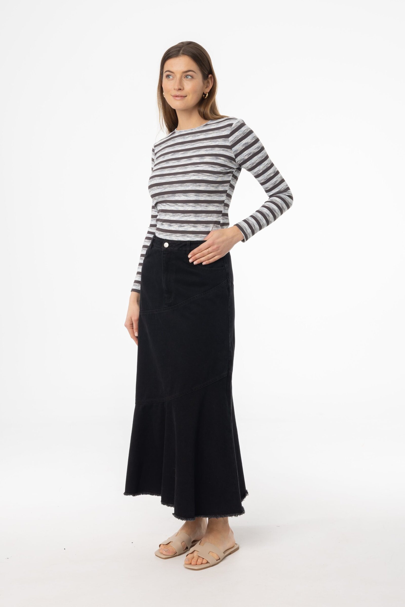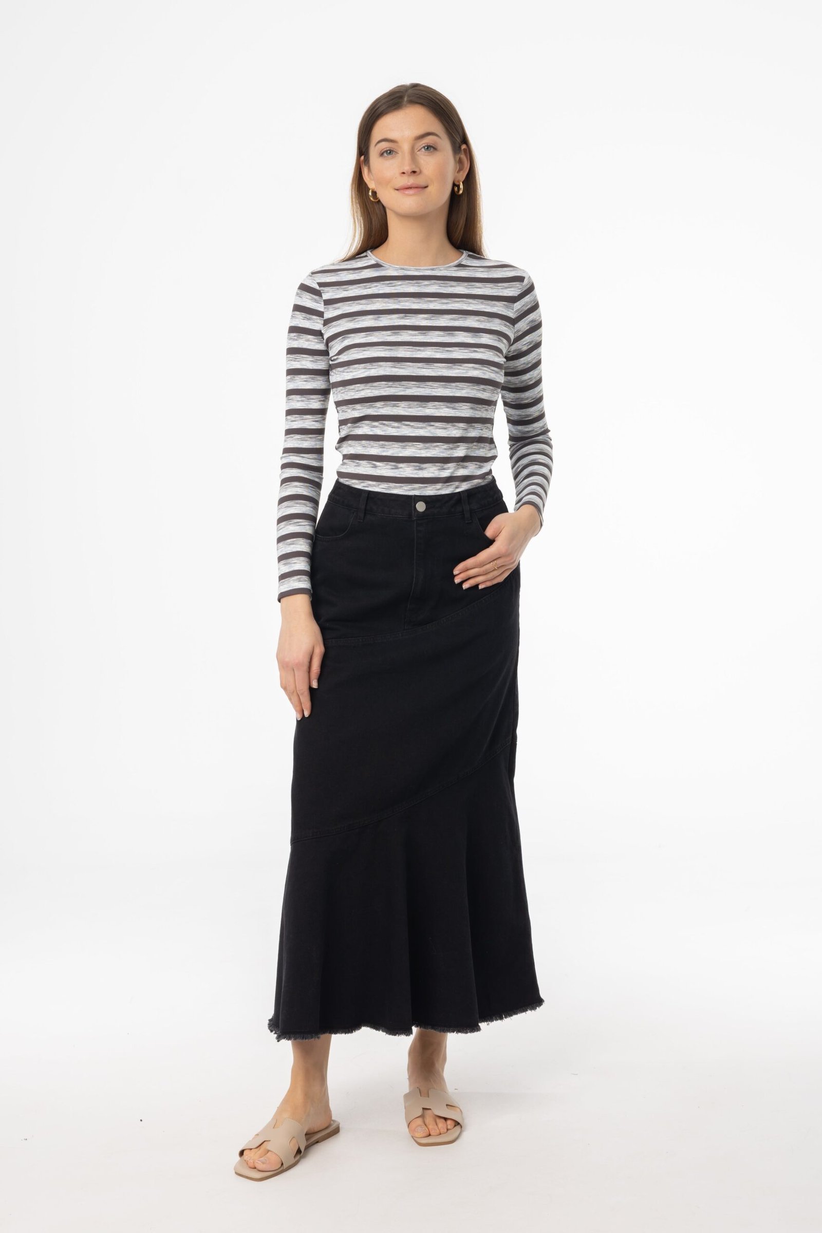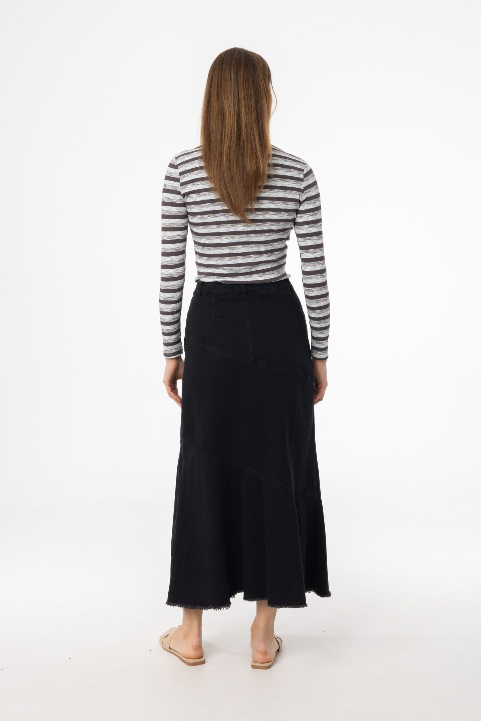 Looking for a denim skirt that stands out? This tiered fringe design adds a playful twist to a classic favorite. Perfect for weekend brunches. city exploring. or warm evenings by the water. Style it with a printed blouse for a playful look or keep it casual with a fitted top and slides.