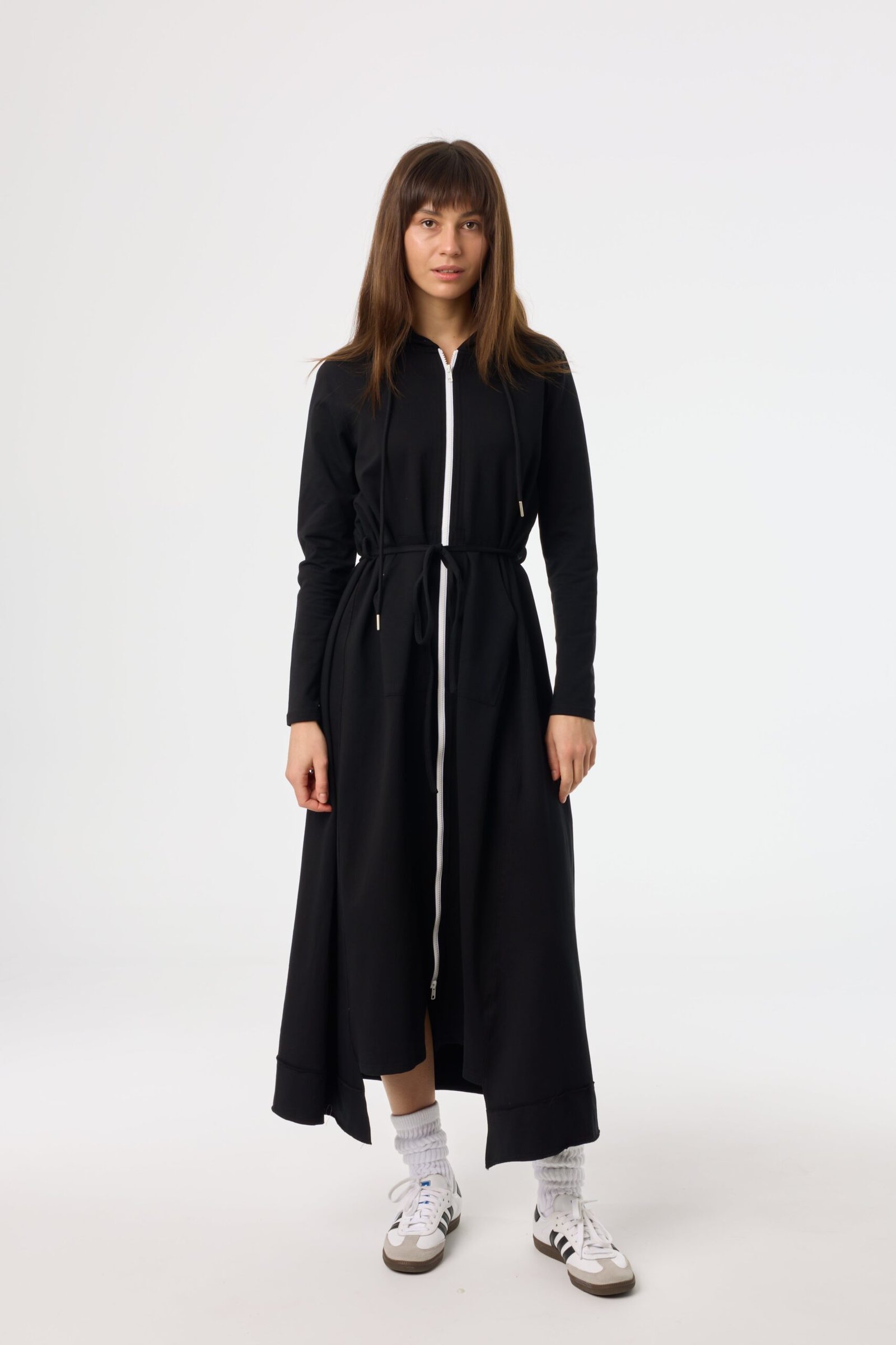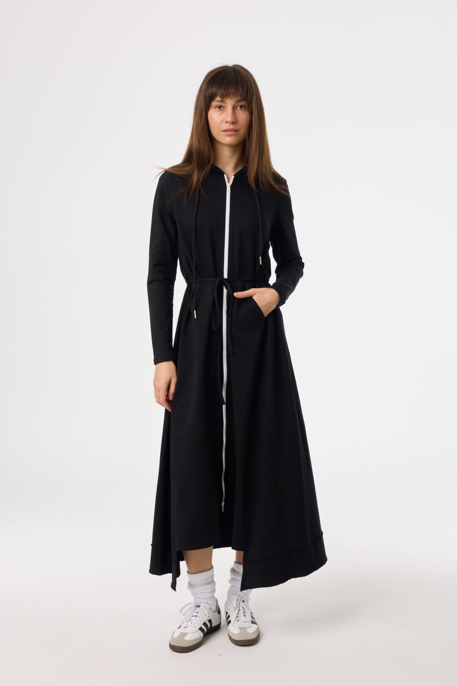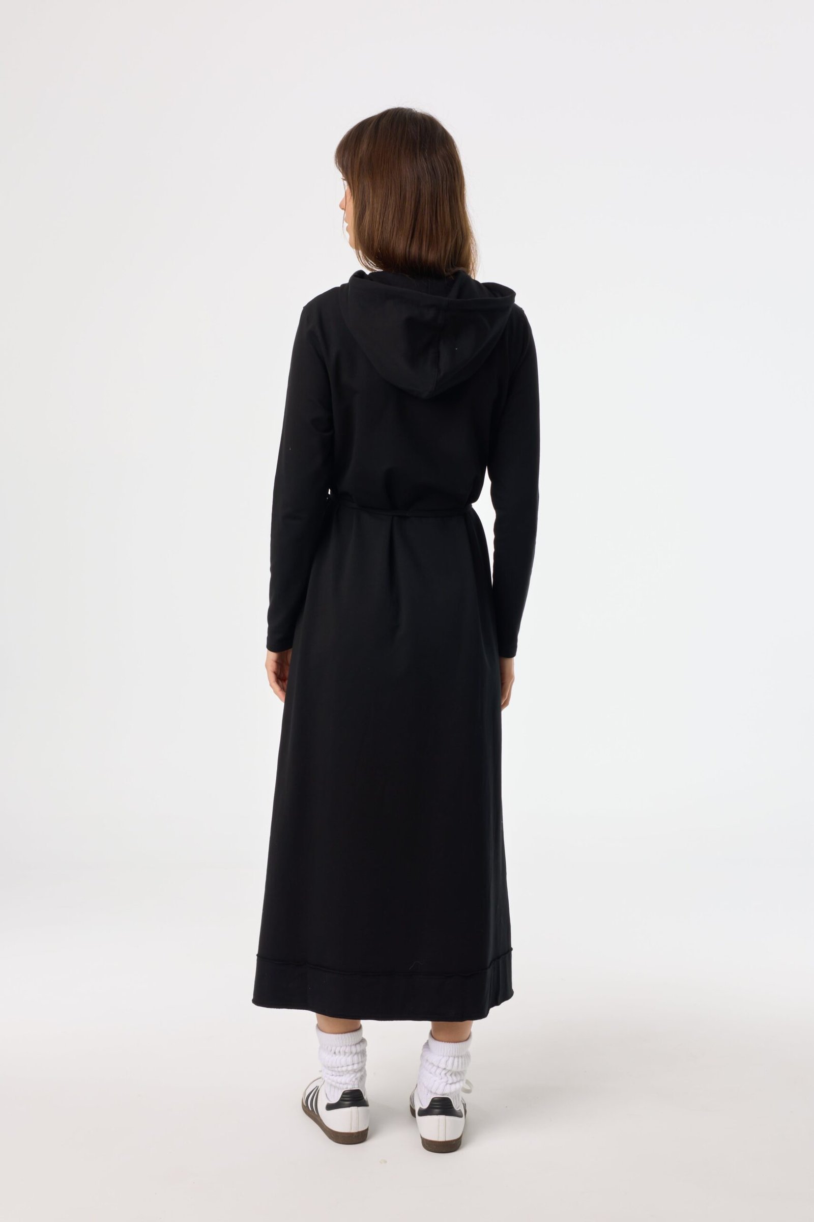 Introducing the classic hoodie zip up sweatshirt dress but with a twist. Including asymmetrical bottom and a thin belt to tie around the waist. these features provide a perfectly imperfect look to this all time classic garment.