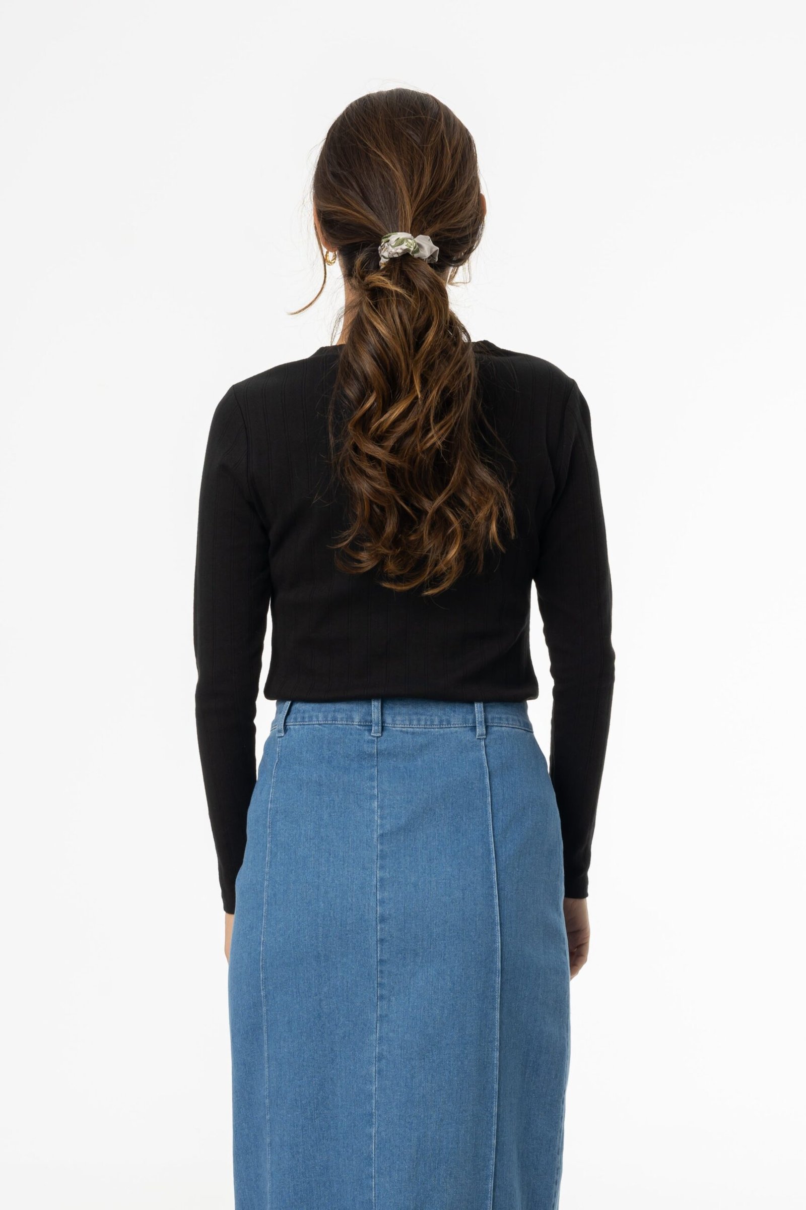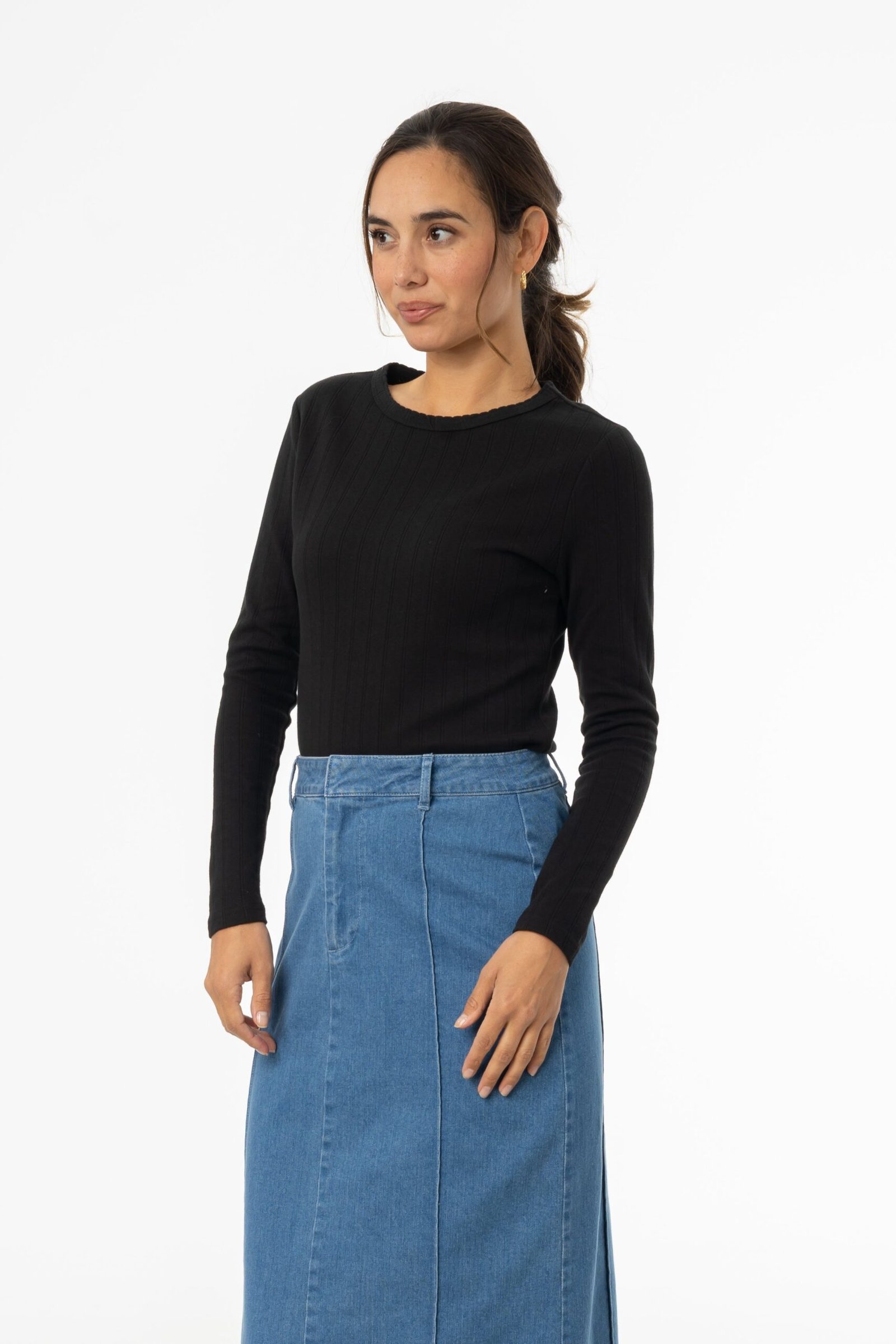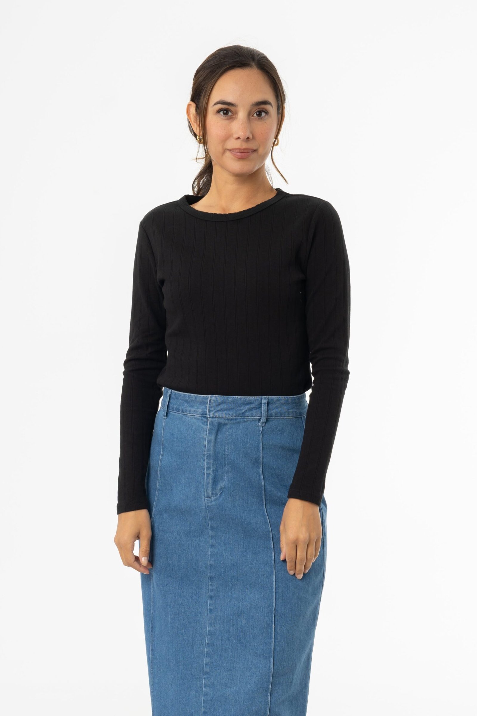 This tee brings just the right balance of softness and structure. with delicate pointelle details and a flattering scalloped trim. Ideal for weekend outings. park picnics. or exploring new places with a camera in hand. Pair it with a denim midi skirt and your favorite sneakers for a fresh. relaxed feel.