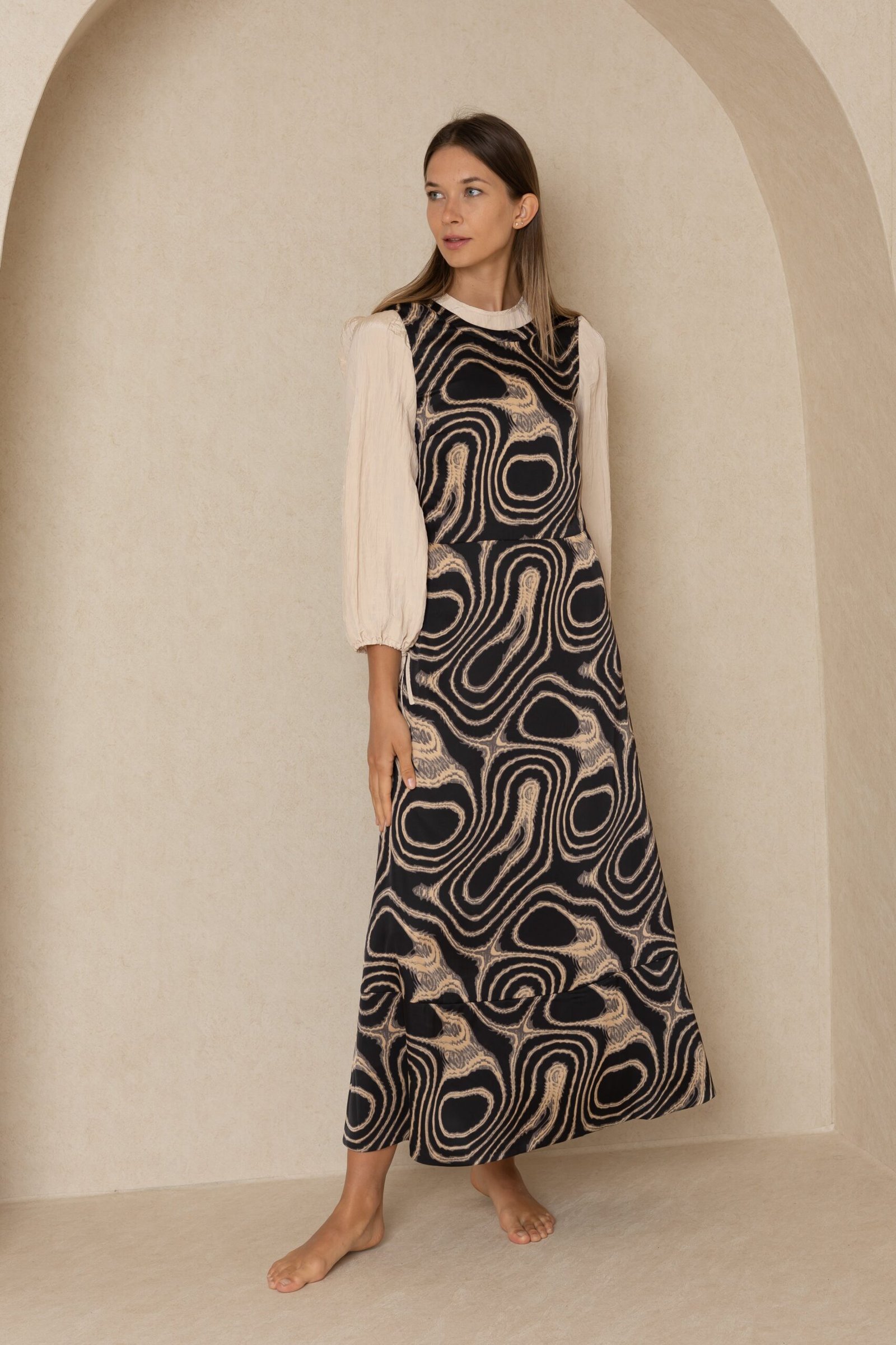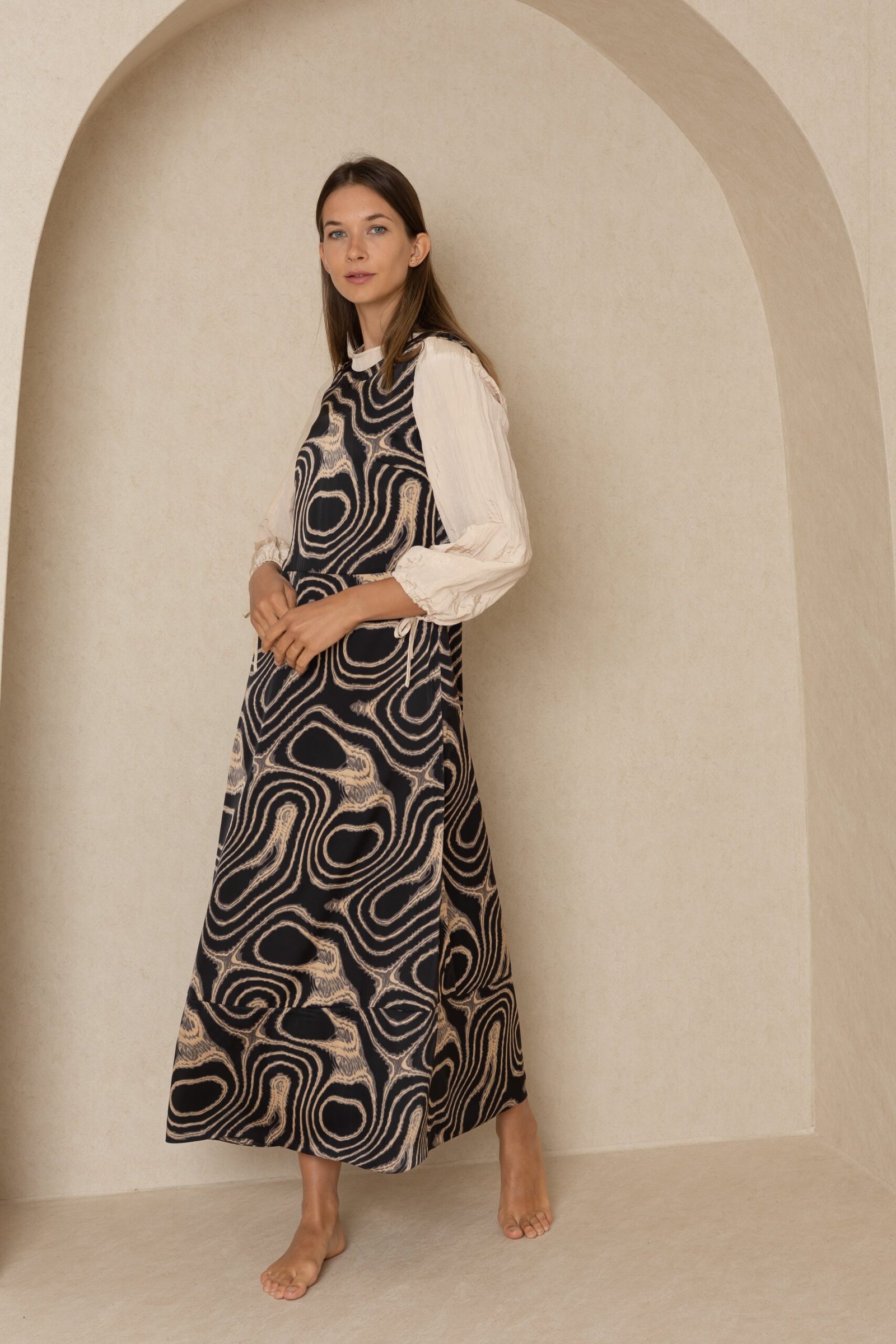 Indulge in sophistication with our Printed Circle Jumper. A chic and elegant addition to your wardrobe. this jumper features an abstract circle design that exudes stylish charm. With a maxi length perfect for summer. this piece is a must-have for any fashion-forward individual.