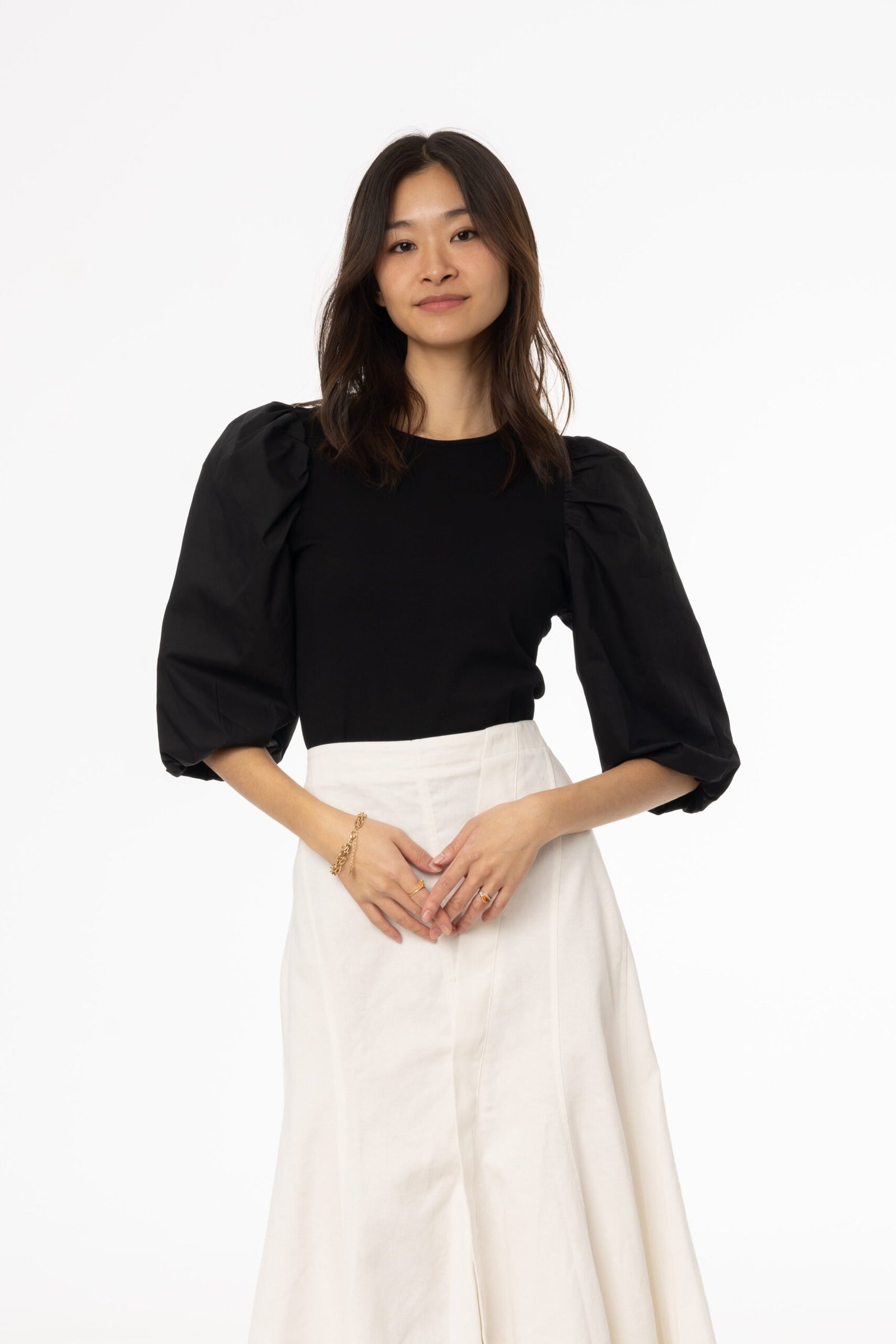 Bring the drama—but make it daytime friendly. This tee stands out with puff sleeves and mixed textures that play up your look without sacrificing comfort. The soft fabric keeps it cozy. while the elevated sleeves give it that little extra something. Throw it on for outdoor coffee dates. flower shop stops. or just because you’re feeling a little fancy today.