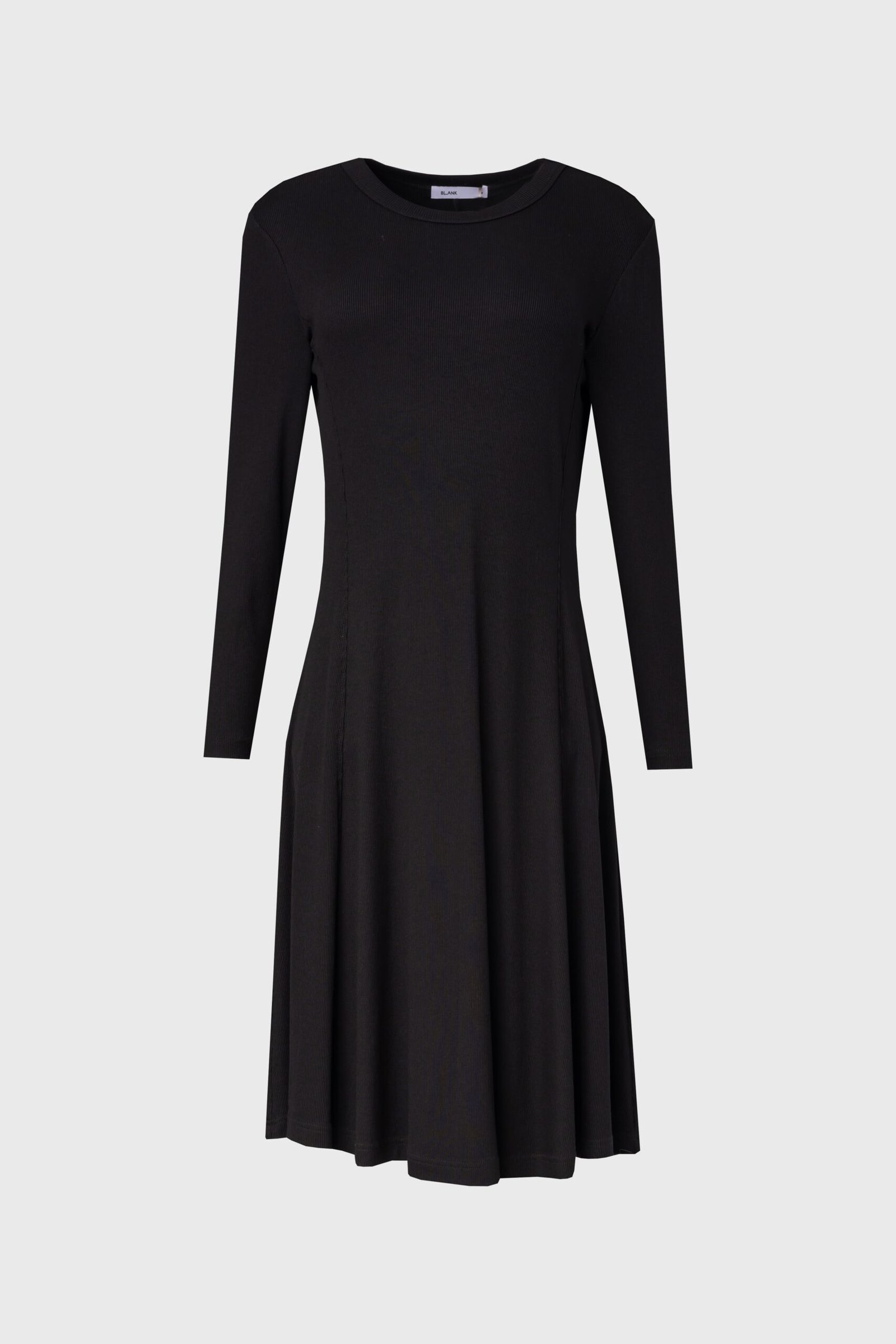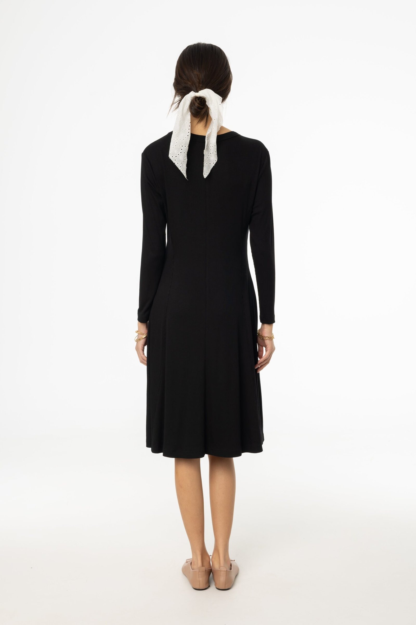 This isn’t just another black dress—it’s the one you’ll reach for. time and time again. The tailored stitching enhances the shape. while the flared cut keeps it light and flowy. Style it with statement earrings and a belt for a cinched-in effect. then add a Blue Denim Cropped Jacket when the evening cools down.